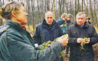 Bild unten: Beate Lezius von der Integrierten Naturschutzstation in Mölln zeigt Norbert Brackmann (r) Torfmoospflanzen, die abgestorben das Moor als Torf pro Jahr um einen Millimeter wachsen lassen.