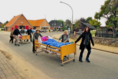 Vom Koberger Dorfgemeinschaftshaus (hinten) rollten Helfer die Betten der Pflegebedürftigen zurück in die Wohngemeinschaft.